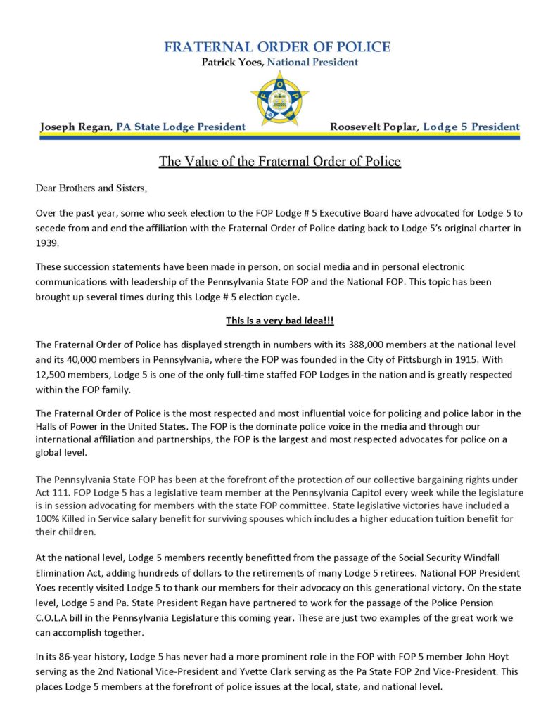 Joint Letter on Members pushing secession from Fraternal Order of Police