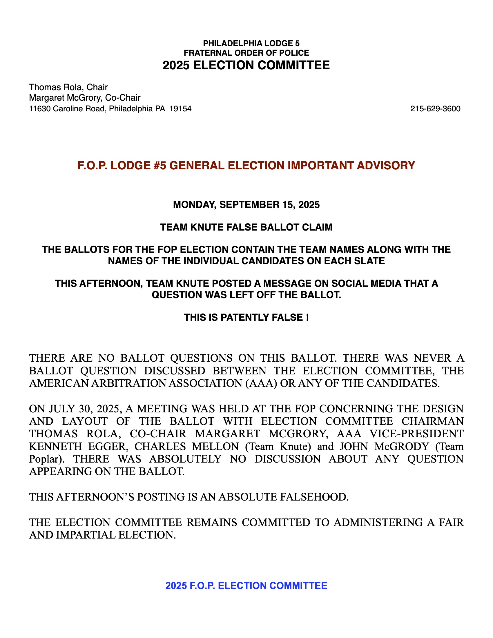 Update from FOP Election Committee