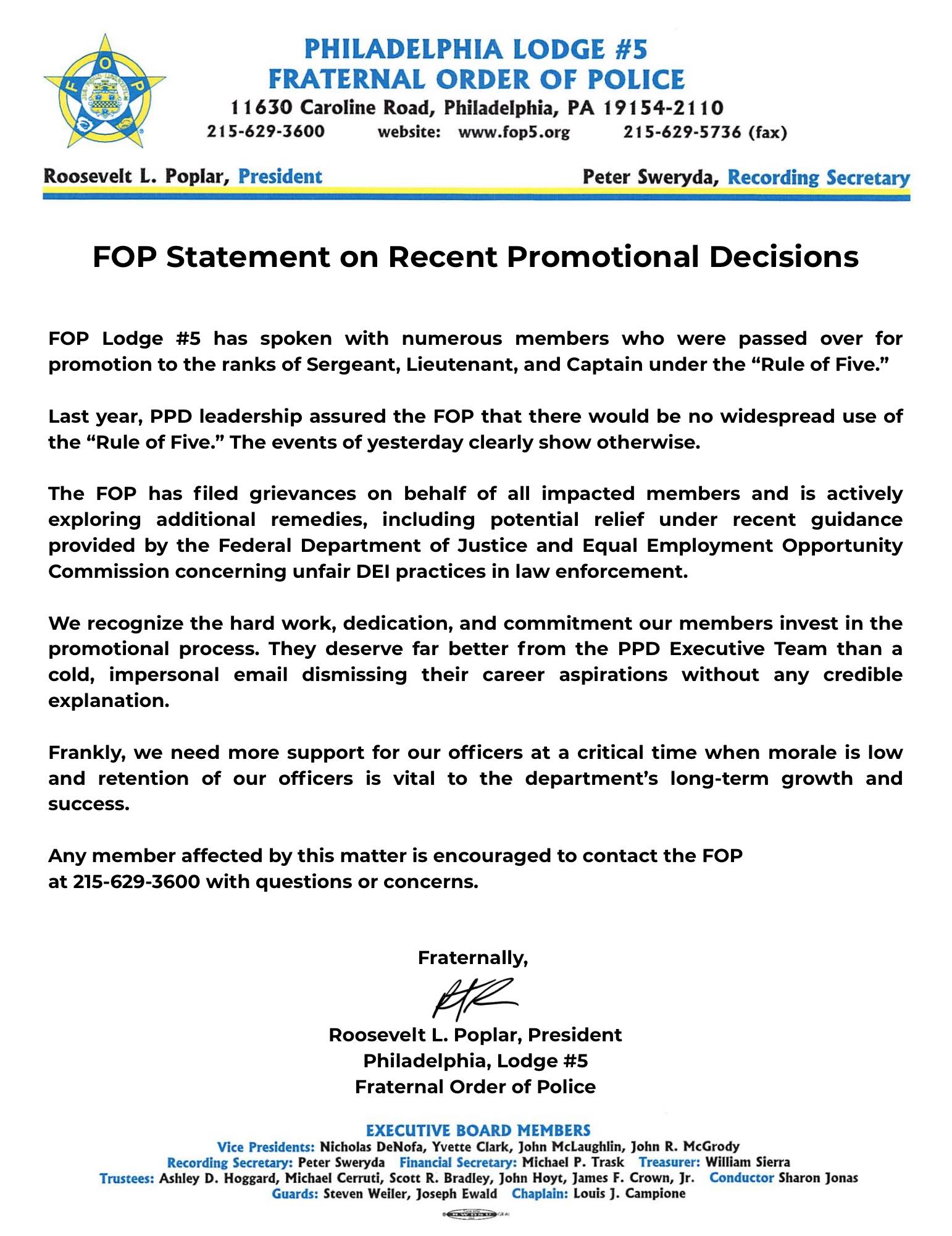 Statement on Recent Promotional Decisions