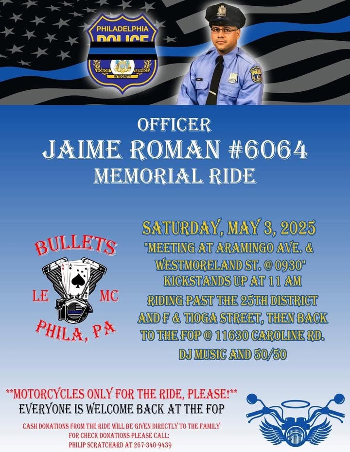 Join us in honoring the memory of Officer Jaime Roman #6064 at the Memorial Ride hosted by Bullets LE MC, Philadelphia Chapter on Saturday, May 3, 2025.