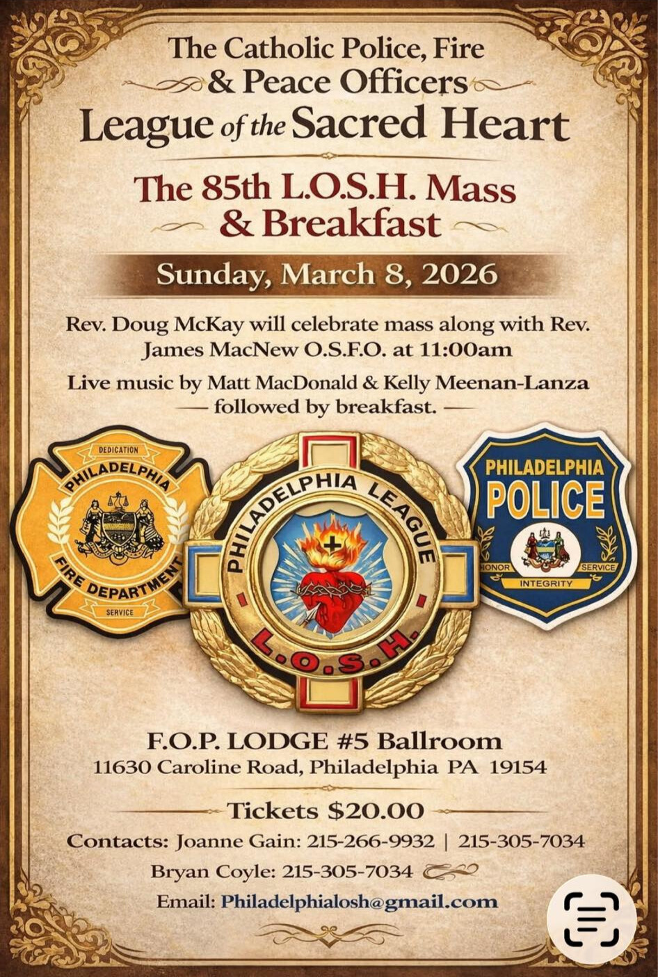 Active and retired members of the Fraternal Order of Police, Philadelphia Lodge #5, along with their families, are welcome to join us each month as we gather to remember and pray for our Fallen Heroes who gave their lives in the line of duty.
