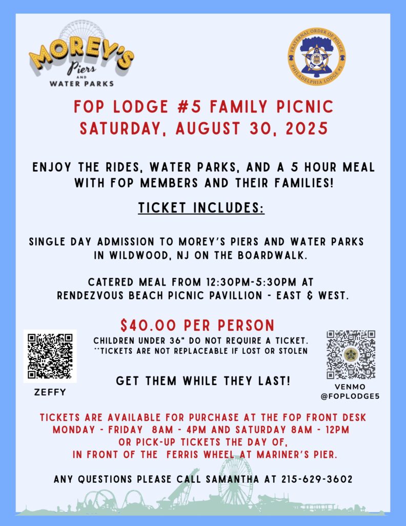Join us this Saturday August 30th for our FOP Lodge 5 Family Picnic at Morey’s Pier in Wildwood, NJ! You ...