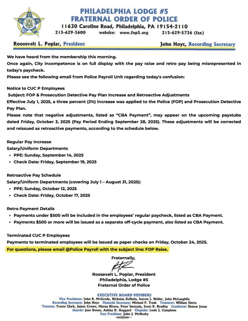 For questions/issues please email @Police Payroll with the subject line: FOP Raise In summary, Police Payroll tried to reflect your ...