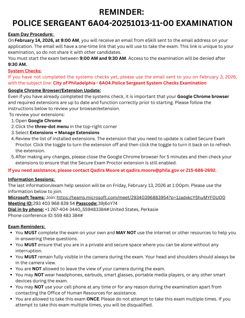This is a reminder for candidates scheduled to take the Police Sergeant Examination on Saturday, February 14, 2026, to complete ...