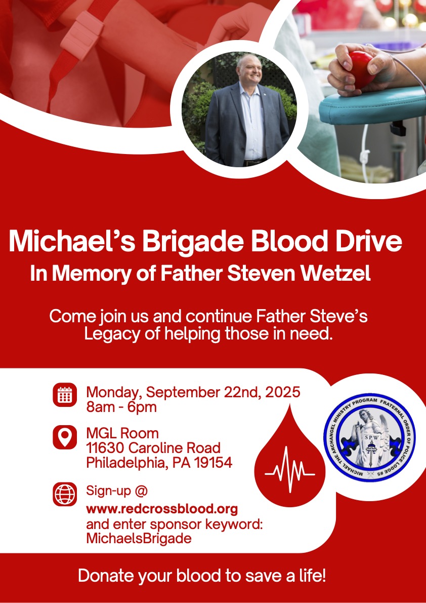 MGL Room 11630 Caroline Road, Philadelphia, PA, United StatesThe next Michael's Brigade Blood Drive, in Memory of Father Steven Wetzel, is scheduled for Thursday, January 22nd! Sign up here: https://www.redcrossblood.org/give.html/find-drive and enter sponsor keyword "MichaelsBrigade"